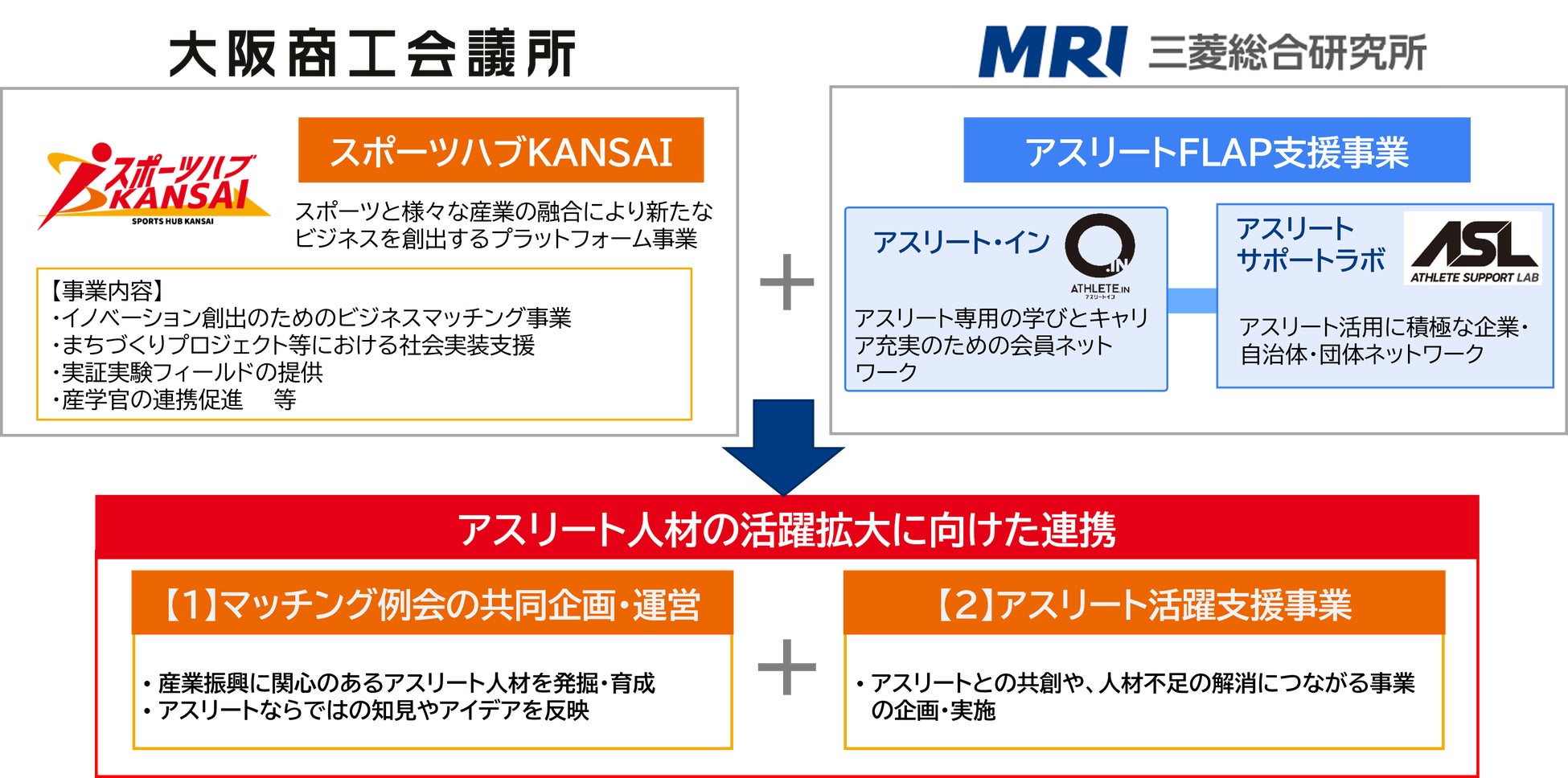 大阪商工会議所(会頭:鳥井信吾)と、株式会社三菱総合研究所(代表取締役社長:籔田健二、以下 MRI)は、アスリート人材の活躍による企業や地域の課題解決や、イノベーションの創出に共同で取り組んで参ります。スポーツ・ウエルネス産業振興にアスリートの知見やアイデアを取り入れて施策を充実させるとともに、ビジネスで活躍できるアスリート人材を発掘・育成することで、スポーツ界で長年の課題となっているアスリートのキャリア形成に貢献します。