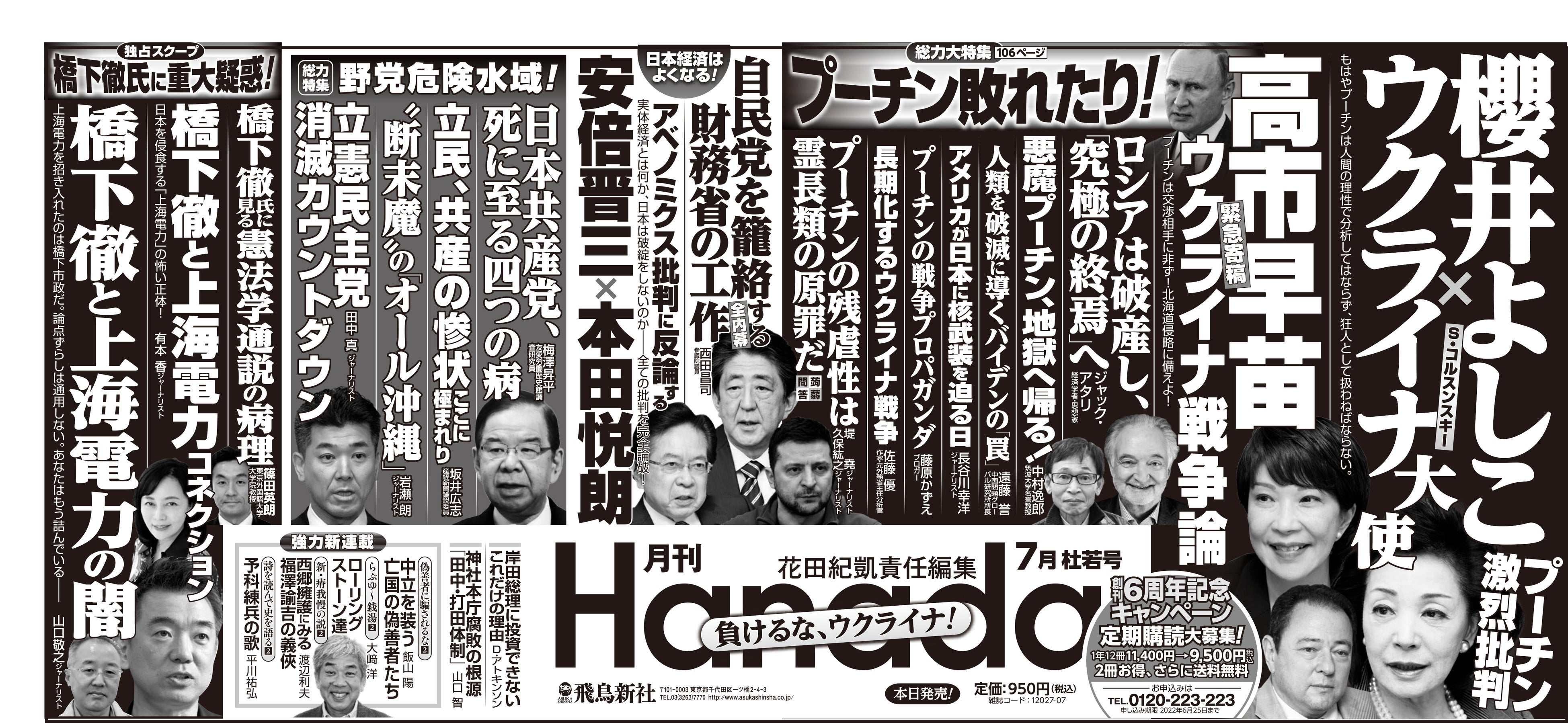 5月27日発売の月刊『Hanada』7月号で、安倍元総理が「アベノミクス批判」に大反論、高市政調会長が「ロシアの北海道侵略に備えるべき」と緊急寄稿。橋下徹氏と上海電力の闇を独占スクープ!