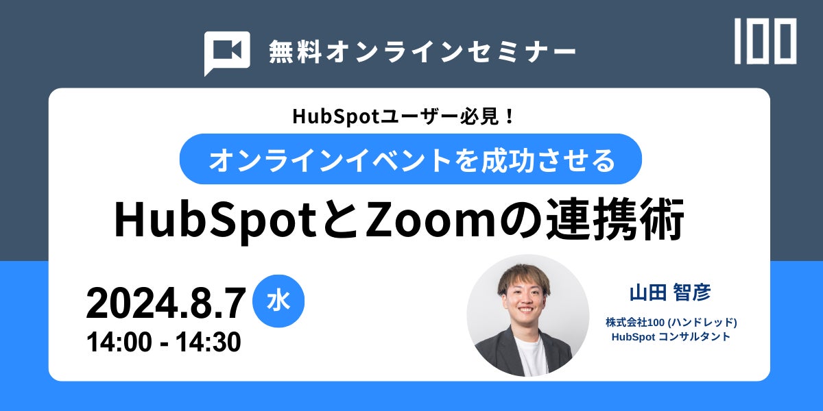 HubSpot Smart CRM™の導入と運用支援サービスを通じてRevOpsソリューションを提供する株式会社100(ハンドレッド、本社:東京都世田谷区、代表取締役:田村 慶)は、2024年8月7日(水)14時から「オンラインイベントを成功させるHubSpotとZoom連携術」をテーマにオンラインセミナーを開催いたします。