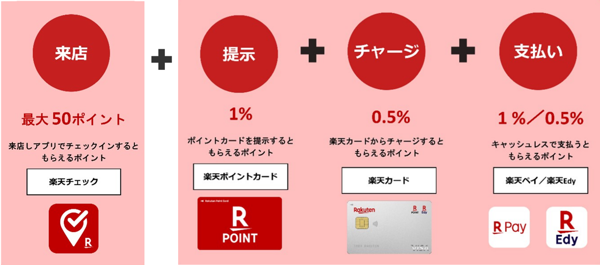 ① 「楽天チェック」による、来店時における「楽天ポイント」の獲得(1回のチェックインにつき、1~50ポイント)