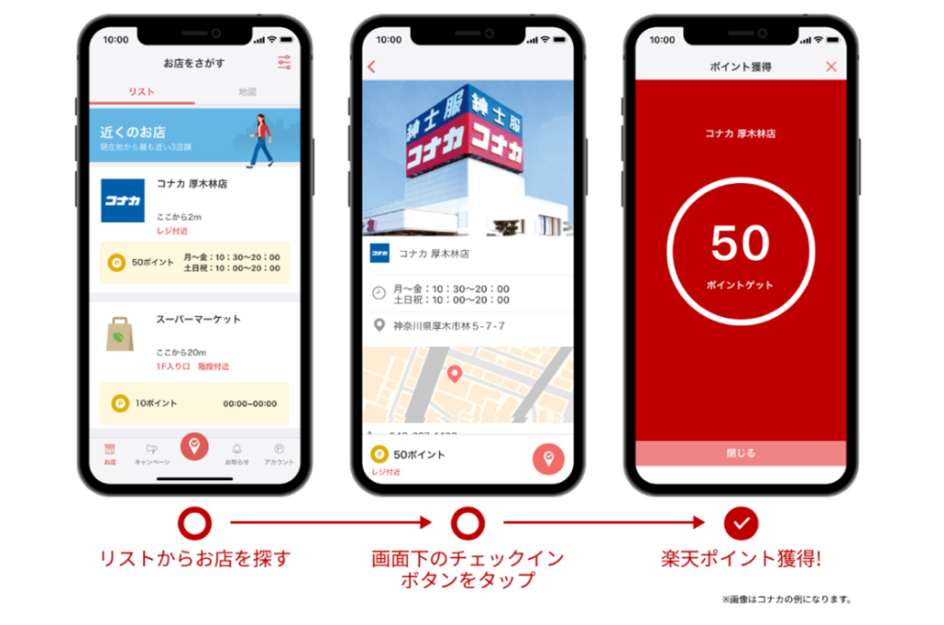 これにより、利用者は店内の指定エリアで「楽天チェック」アプリを起動し、チェックインするだけで「楽天ポイント」が貯まります。
