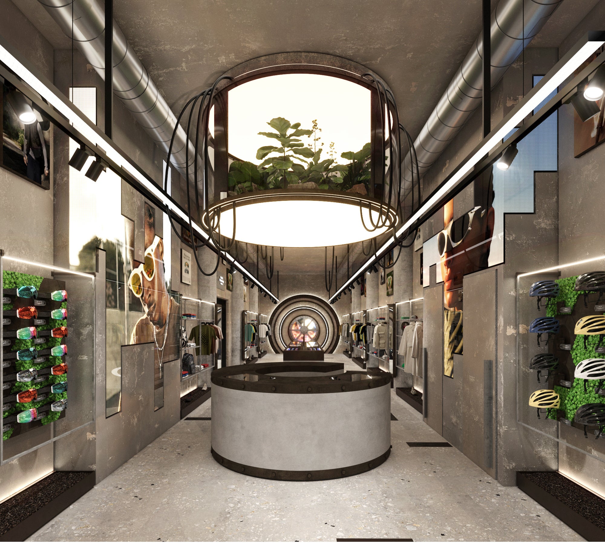 オークリーらしいインダストリアルな空間が広がる店内は、むき出しの機械的な構造や無骨な素材を活かしたブルータリズムの建築様式をベースに設計されています。正面に設置されたオークリー本社のアイコンである大型タービンを模した造形や、吊り下げ式のプラント照明器など、近未来のプロダクトラボを思わせる要素の詰まった空間は、過去から未来へと繋がるブランドの革新性を表現したオークリーのFuture Genesis(フューチャー・ジェネシス)の世界観を投影しています。