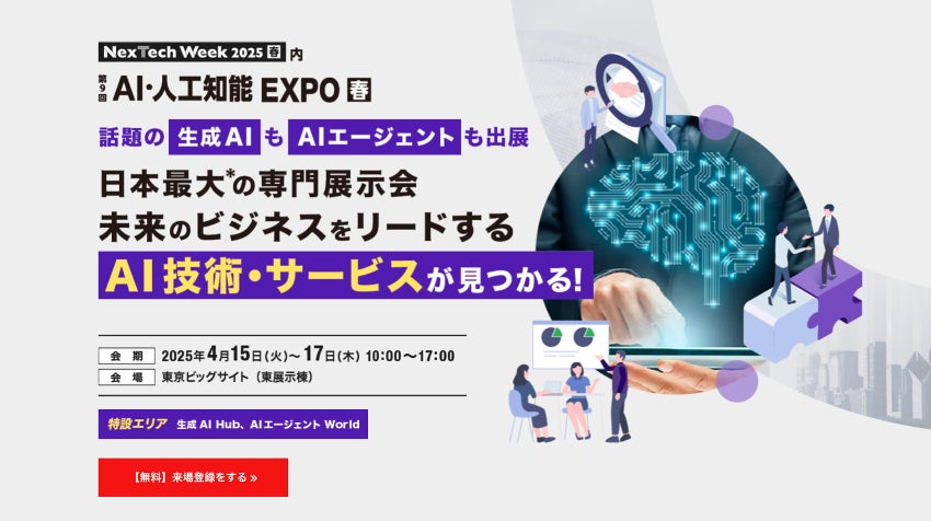 2025年4月15日(火)〜17日(木)に東京ビッグサイトで開催される「NexTech Week 2025春」内の「第9回AI・人工知能EXPO春」。本イベントは、日本最大のAI技術の専門展示会です。