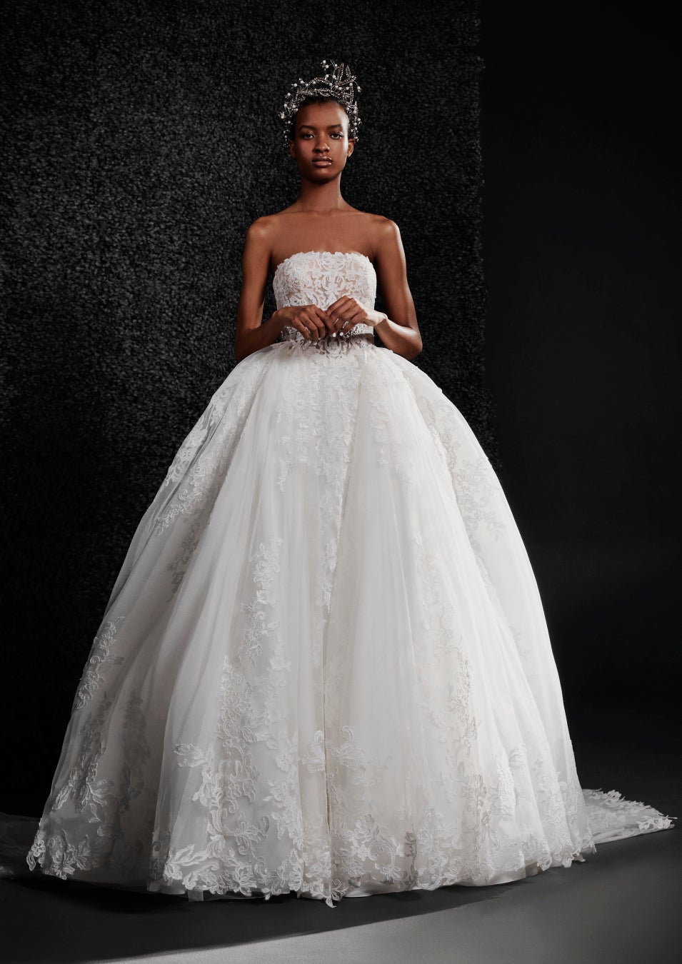 柔かなソフトチュールにアクセントとして大胆にオーガンザを組み合わせるのは、VERA WANGならでは。