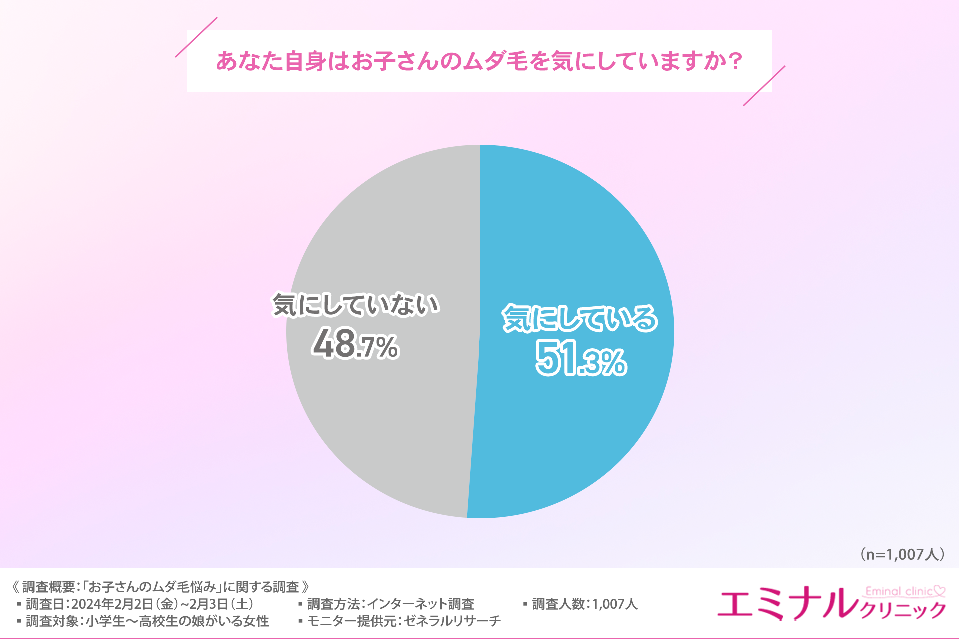 「あなた自身はお子さんのムダ毛を気にしていますか?」と質問したところ、『気にしている(51.3%)』という回答結果になりました。