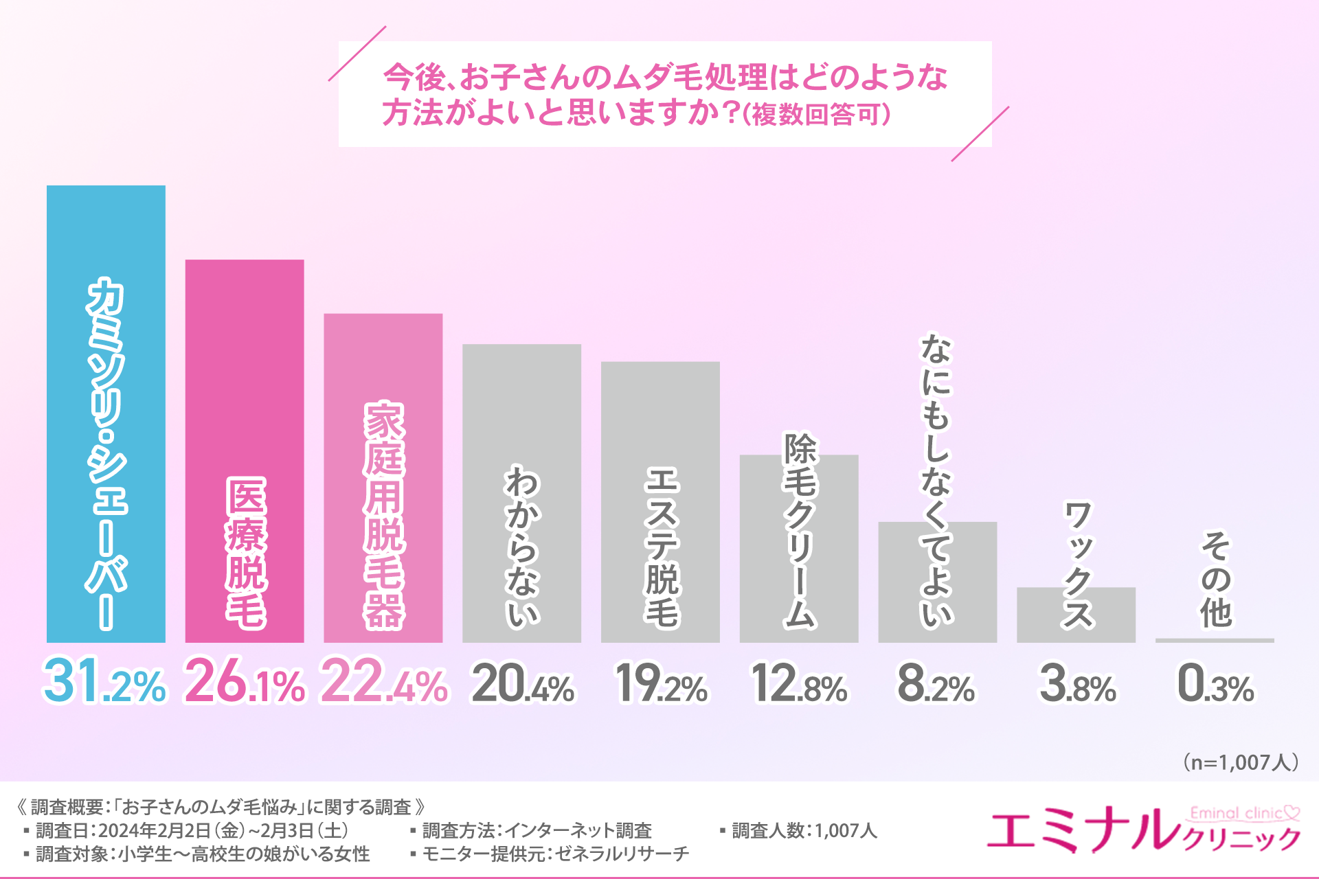 「今後、お子さんのムダ毛処理はどのような方法がよいと思いますか?(複数回答可)」と質問したところ、『カミソリ・シェーバー(31.2%)』と回答した方が最も多く、次いで『医療脱毛(26.1%)』『家庭用脱毛器(22.4% 』続きました。