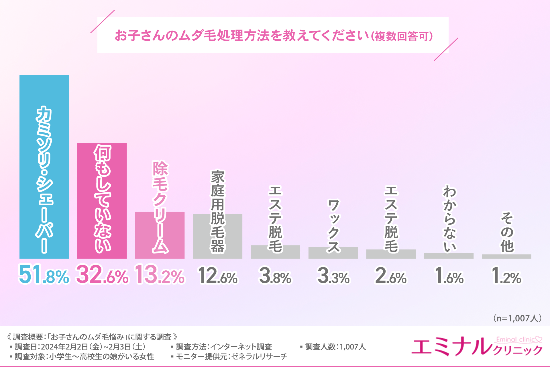 「お子さんのムダ毛処理方法を教えてください(複数回答可)」と質問したところ、『カミソリ・シェーバー(51.8%)』と回答した方が最も多く、次いで『何もしていない(32.6%)』『除毛クリーム(13.2%)』と続きました。
