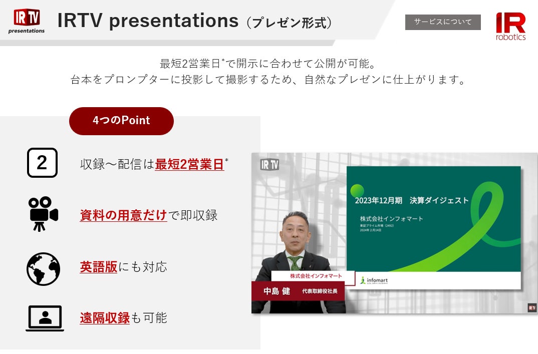 IRTVは今後も企業の最適なIR活動と投資家の皆様に価値ある情報を提供するために、常に新しい取り組みを行ってまいります。