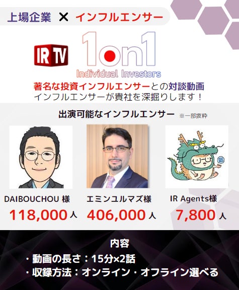 影響力のある著名投資インフルエンサーとコラボすることで企業の認知度向上を狙う企業様におススメです。