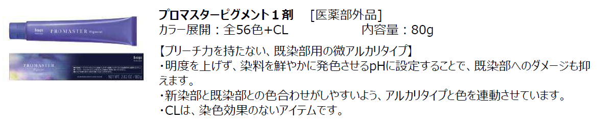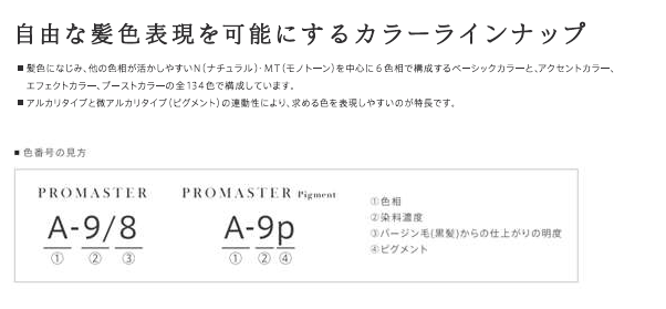 ・プロマスターと色を連動させたプロマスターピグメントにより、新生部と既染部との色合わせがしやすく、使い分けることで既染部へのダメージを抑えます。