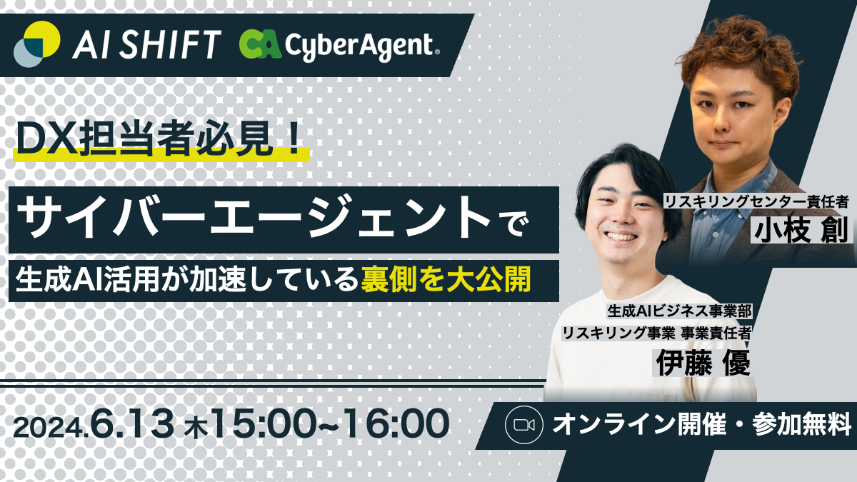 「AIシフトサービス」の提供に際して、生成AIの活用・定着に取り組む担当者の皆様へむけて、サイバーエージェントでの生成AI活用の取り組みを公開するセミナーを実施いたします。