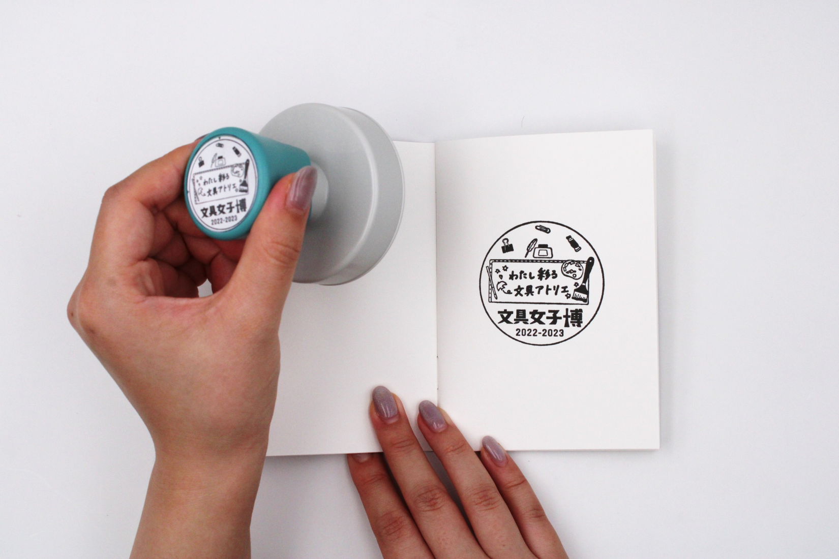文具女子博来場の記念に会場内5か所にスタンプをご用意!出店者とのコラボデザイン他、アトリエをイメージしたスタンプをお楽しみいただけます。大人気のパスポート風ノートも販売いたします!