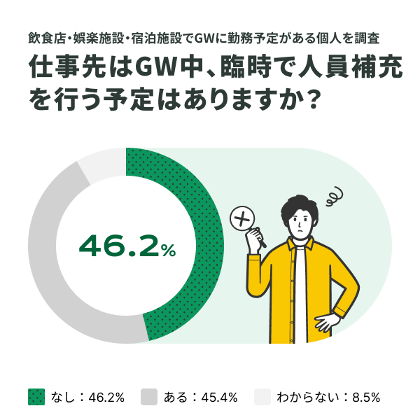 ・「仕事先では、GW中に臨時でアルバイトやパートなどの人員補充を行う予定はありますか?」という問いには、「ある」が45.4%、「なし」が46.2%、「わからない」が8.5%でした。なお、「仕事先のGWのシフトは十分に人が足りていますか」という問いに、「足りない」と回答した個人に同様の質問をしたところ、人員補充をする予定があると回答したのは57.6%で、約4割の仕事先では人手が不足していても人員補充の予定がないことがわかりました。
