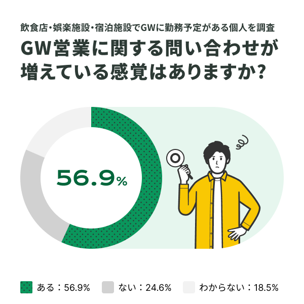 ・「昨年に比べて、GWの営業(営業の有無や時間、予約等)についての問い合わせが増えている感覚はありますか?」という問いには、「ある」が56.9%、「ない」が24.6%、「わからない」が18.5%で、半数以上が昨年よりもGW営業についての問い合わせが増えていると感じています。