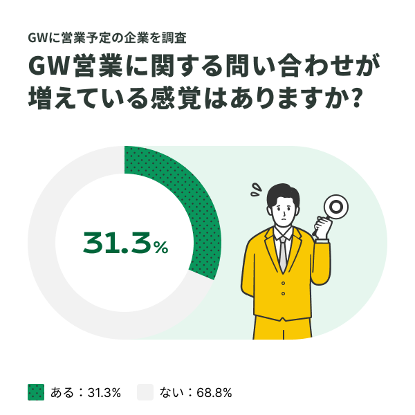 ・「昨年に比べて、GWの営業(営業の有無や時間、予約等)についての問い合わせが増えている感覚はありますか?」という問いには、「ある」が31.3%、「ない」が68.8%で3割以上の企業は昨年よりもGWの営業に関する問い合わせが増えていると感じていることがわかりました。