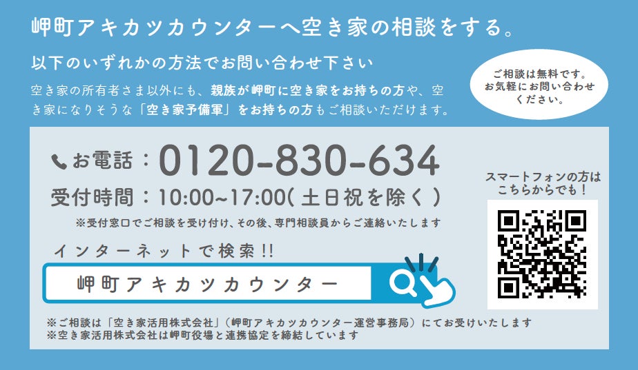2021年10月11日に岬町とアキカツが締結した「空き家等の利活用モデル事業に関する連携協定」に基づき設置されたもので、空き家に関する専門的な相談を地域住民の皆様に提供いたします。