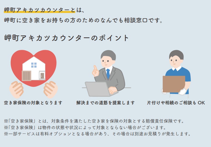 空き家の所有者、地域、事業者、自治体を繋ぐマッチングプラットフォーム「アキカツナビ」を運営する空き家活用株式会社(本社:東京都港区、代表取締役社長:和田 貴充、以下アキカツ)と大阪府泉南郡岬町地域おこし協力隊は、2024年11月18日より、アキカツが運営する空き家の相談専門サービス「岬町アキカツカウンター」を開設したことをお知らせします。
