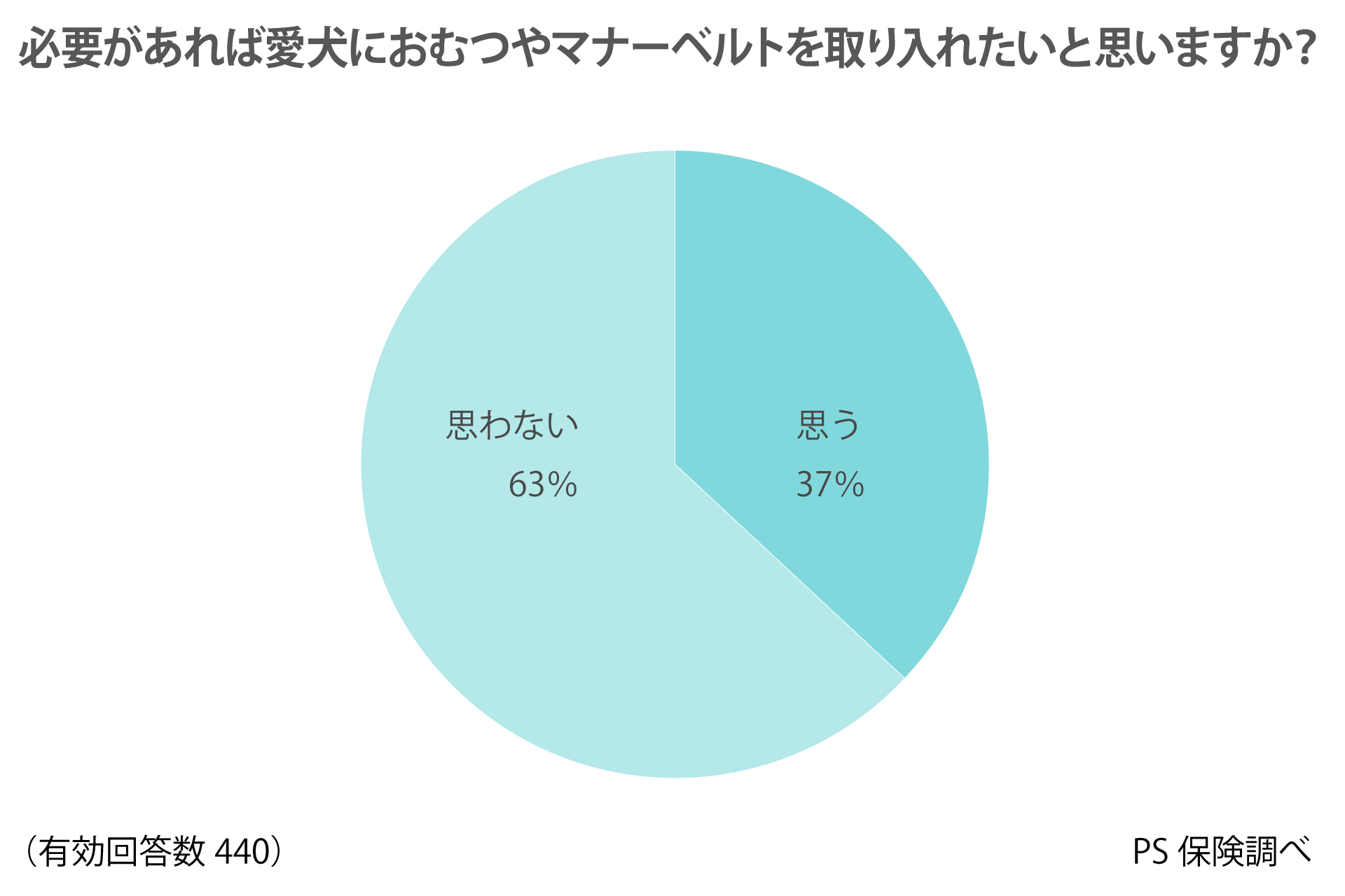 これまで愛犬におむつやマナーベルトを取り入れたことがない飼い主に、必要があれば取り入れたいかを尋ねたところ、「思わない」が63%で多数派となりました。