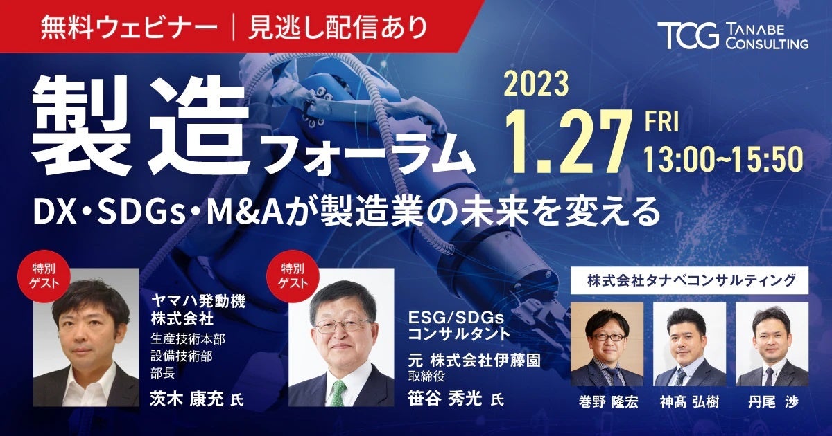 本フォーラムが、自社がどのようにDX・SDGs・M&Aに取り組み、サステナブルな製造業へと進化するのかを考え、製造業の未来を創造していくための一助となりましたら幸いです。