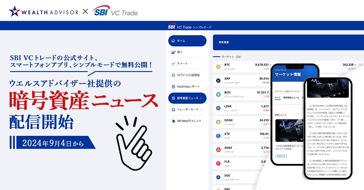 ウエルスアドバイザー社提供の暗号資産ニュース配信開始~SBI VCトレードの公式サイト、スマートフォンアプリ、シンプルモードで無料公開~