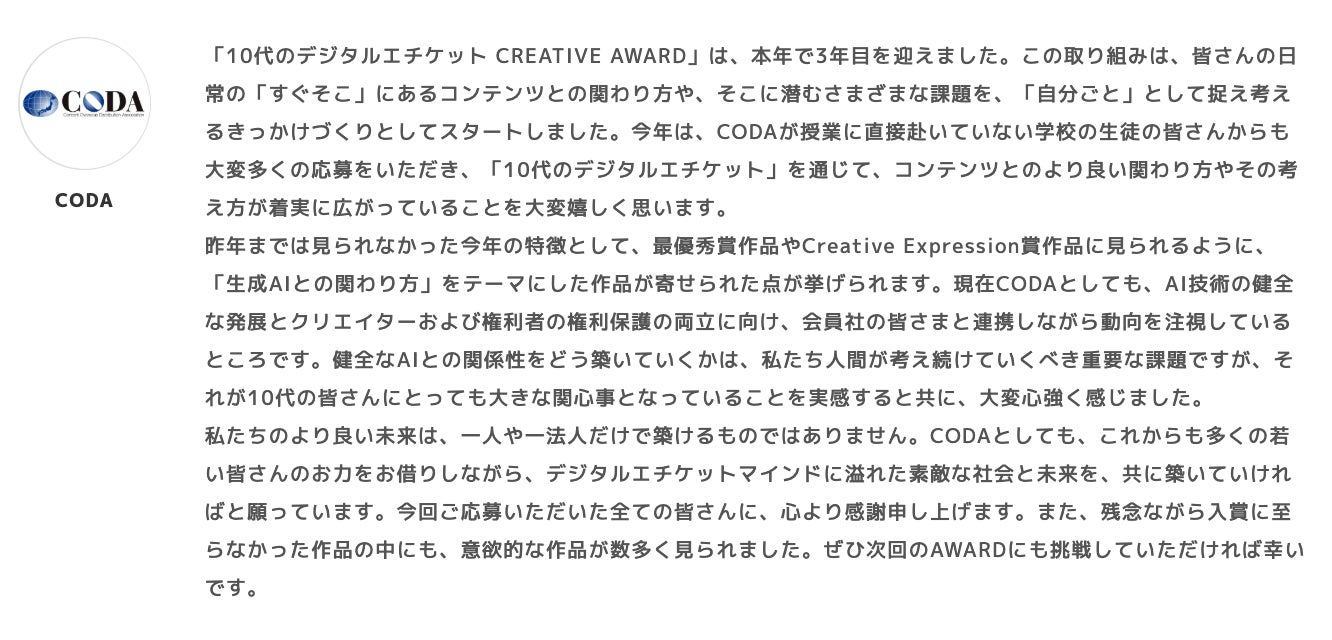 2025年12月24日(水)、一般社団法人コンテンツ海外流通促進機構 (CODA) は、日本の10代を対象として実施した「10代のデジタルエチケット CREATIVE AWARD 2025」の審査結果を発表しました。今年度、3回目を迎えた本アワードは、デジタル社会におけるソーシャルエチケットへの意識を高めることを目的としています。