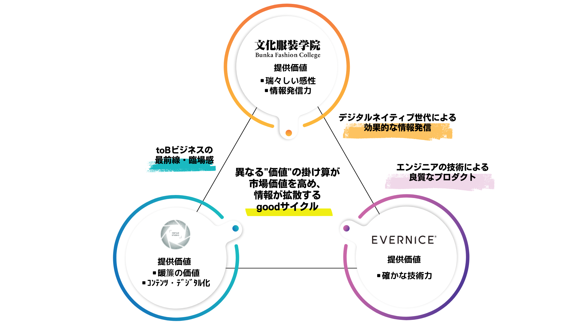 文化服装学院は、2023年6月に創立100周年を迎えます。この記念すべき年に本プロジェクトに参画する機会をいただきましたことを、関係の皆さまに厚く御礼申し上げます。ファッション流通高度専門士科2年「ビジネスプランニグ」の授業の一環で、「ISETAN STUDIO」の見学、撮影現場で働く皆さまへのヒアリングや職種理解を深め、プロモーションムービーの企画・演出・撮影を行いました。また、3年生がEVERNICE®️の素材の魅力を活かし、ファッション性と機能性の視点でユニフォームのデザインを考案しました。プロモーションムービーの中では、実際に撮影現場で働く皆さまにユニフォームを着用いただいております。学生こだわりポケットやストラップなど、細かなディテールに注目しご覧ください。