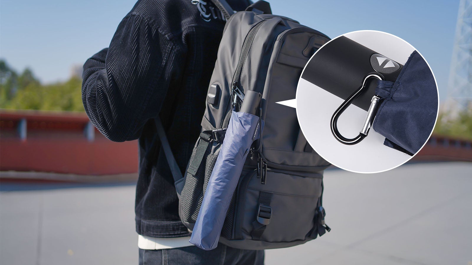 さらに、収納袋にはカラビナを付属。カバンや傘の持ち手に引っ掛けておけるため、紛失の心配もありません。細部にまで配慮したデザインで、便利さと安心感をプラスしました!