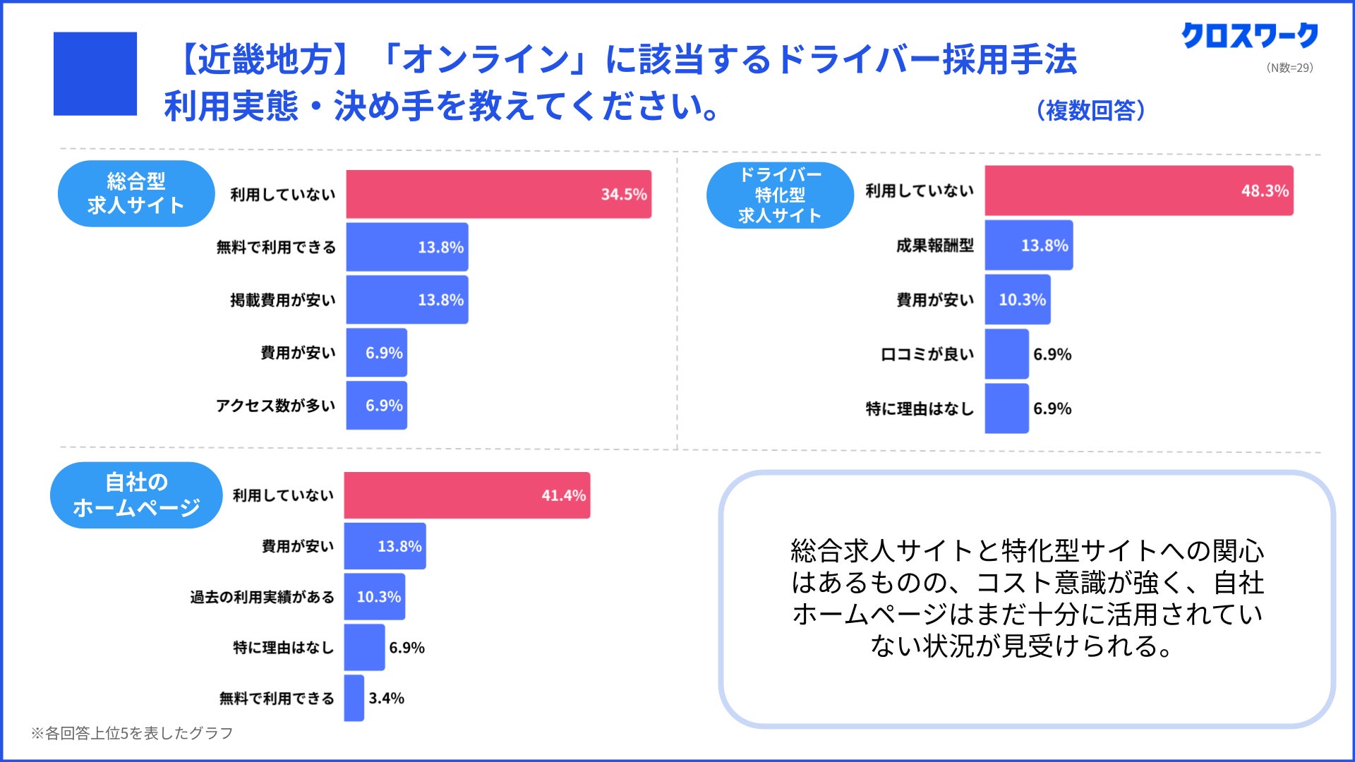 3)近畿、ドライバー採用にハローワーク利用率は平均的、一方、新しい手法への挑戦意欲は低く、オンライン活用に"遅れか