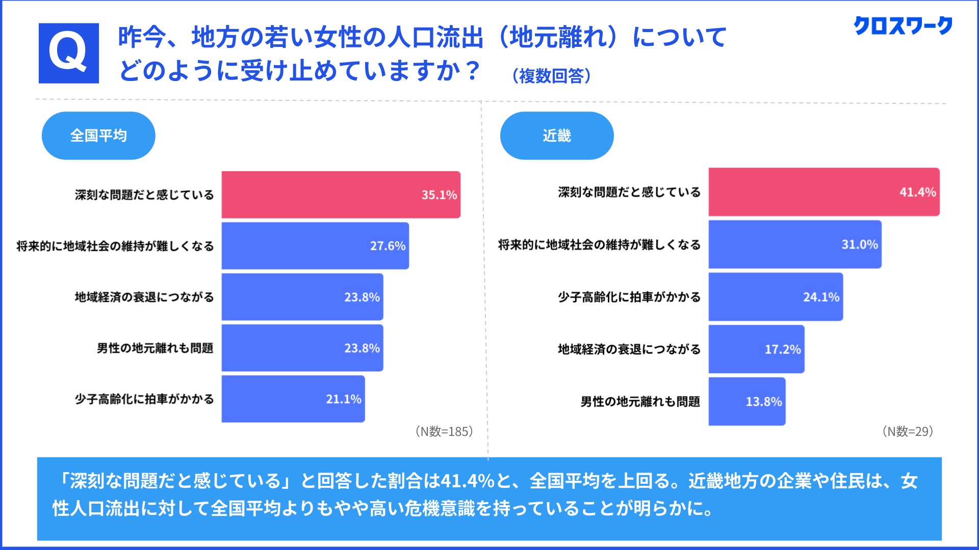2)人材確保の課題:女性人口流出、近畿は4割超が「深刻な問題」と回答。関東・全国平均*を上回る