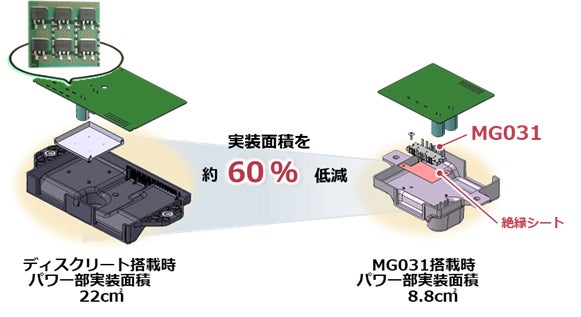 高集積化により、ディスクリート製品搭載時と比較し、実装面積を約60%低減