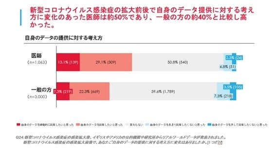また、今回の調査では、日本と海外のRWDに対する信頼感、安心感についても次の点が明らかになりました。一般の方・医師ともに、「日本のデータのほうが信頼感・安心感がある」と回答した人が大半を占める一方で(一般の方82.8%、医師74.2%)、日本の限られたデータと海外の大規模データのどちらを重視するかと聞いたところ、海外のデータを重視すると回答した人が一般の方で57.0%、医師で60.8%となりました。一般の方、医師ともに、日本のデータを望んでいるものの、データ量が多ければ海外のデータのほうを信頼し活用を許容する傾向があることがわかりました。また「新型コロナウイルス感染症の感染拡大後にイギリスやアメリカの公的機関や研究所からRWDが発表されましたが、感染拡大前後で自分自身のRWDの提供に対する考え方に変化はありましたか?」との質問に対し、「自身のデータを共有したいと思った」のは、一般の方で29.6%、医師42.2%と、「共有したくないと思った」人(一般の方10.8%、医師7.1%)を大きく上回りました。