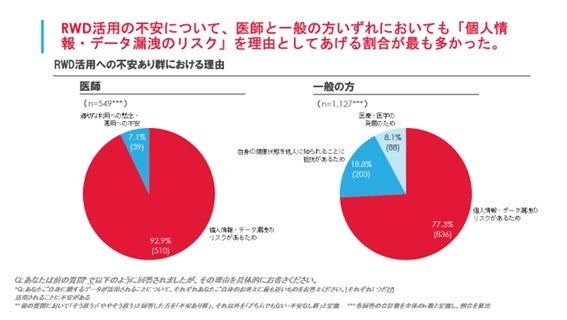RWD活用に不安を持つ理由として、一般の方の77.3%、医師の92.9%が個人情報・データの漏洩リスクと回答