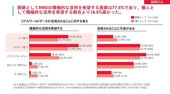 医師のRWDに対する理解・認知は一般の方に比べて高く、77.5%が医師の立場でRWDの積極的な活用を希望