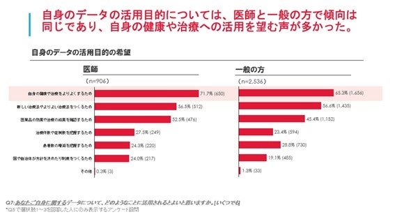 RWDの活用については、一般の方の44.4%、医師の59.0%が自分自身のRWDを積極的に活用することを希望しており、一般の方・医師ともに、自身の健康や治療のため(一般の方65.3%、医師71.7%)、新しい治療法やより良い治療法を見つけるため(一般の方56.6%、医師56.5%)、また医薬品の効果や治療の成果を確認のため(一般の方45.4%、医師52.5%)に活用を望んでいることがわかりました。医師としての立場で確認した際、RWDの積極的な活用を希望する医師は77.5%であり、置かれた立場によりRWDの積極的活用に対する考えが異なることがわかりました。