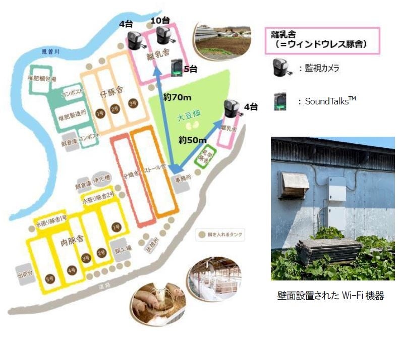 その通信を利用して、監視カメラ18台によりウィンドウレス豚舎(3棟)内を遠隔監視し、そのうち1棟は「SoundTalksTM」モニター5台による咳音検知と温湿度モニタリングも併せて行い、離乳豚の健康維持を図るとともに、農場の生産性向上・出荷品質向上に取り組んでいます。