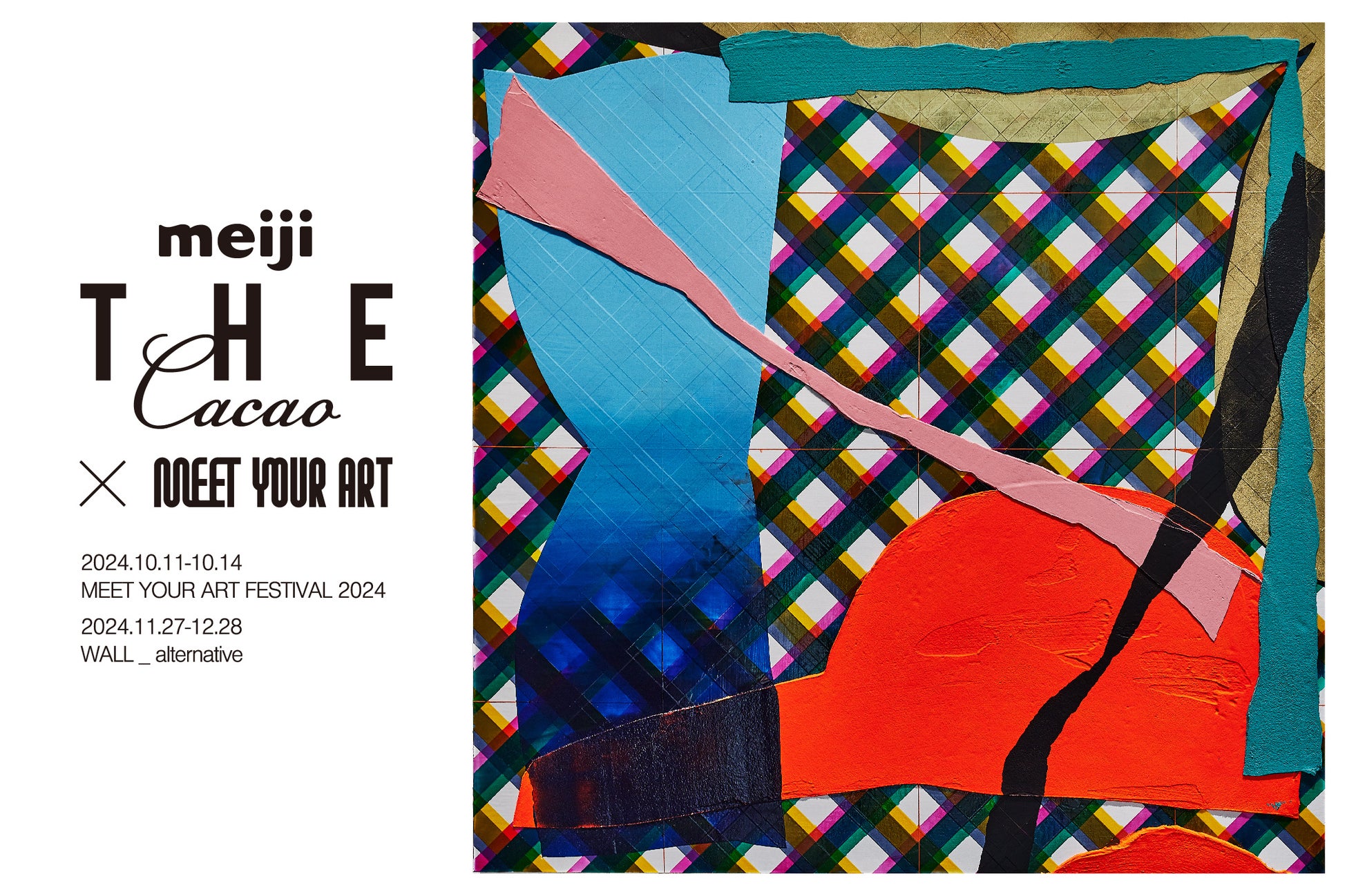 今回のコラボレーションでは、ACAを含むMEET YOUR ART FESTIVAL実行委員会と東京都が主催し、2024年10月11日(金)~14日(月・祝)まで開催される国内最大級のアートとカルチャーの祭典『MEET YOUR ART FESTIVAL 2024「NEW ERA」(東京・天王洲)』と、ACAが運営するオルタナティヴ・スペース「WALL_alternative(東京・西麻布)」で複合的に「明治 ザ・カカオ×アート」企画を実施することを通し、アートを鑑賞しながら「明治 ザ・カカオ」を愉しんでいただく豊かな体験を複数創出することで、カカオ本来の魅力とカカオに込められたコンテクストにスポットライトを当てるとともに、「明治 ザ・カカオ」同様に物語やコンテクストを持つアートと、それを生み出すアーティストの魅力にもスポットライトを当てることを目指します。
