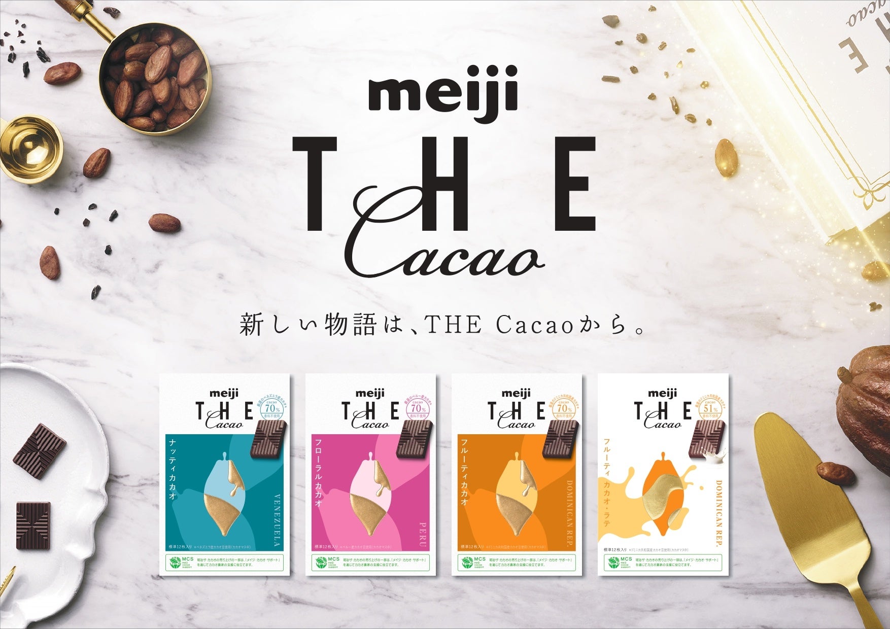 「明治 ザ・カカオ」は、明治独自のカカオ農家支援活動「メイジ・カカオ・サポート」を実施した地域のカカオ豆を使用し、カカオの産地から製法まですべてにこだわった、明治にしか引き出せない、カカオ本来の香味を活かした香料不使用のチョコレートです。「明治ザ・カカオ」は、磨き上げてきたカカオの3つの香味を軸とした4つのラインナップ。ナッティな香りのベネズエラ産カカオ豆を使用した「ナッティカカオ」、フローラルな香りのペルー産カカオ豆を使用し「フローラルカカオ」、フルーティな香りのドミニカ共和国産のカカオ豆を使用した「フルーティカカオ」、そしてフルーティカカオをベースにミルクを合わせた「フルーティカカオ・ラテ」。