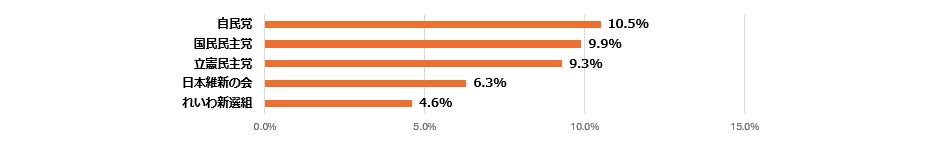 支持政党がある人にその理由を聞くと、「その政党が掲げる政策を支持しているから」8.2%が最多で、「実績や歴史があるから」6.4%、「期待できそうだから」6.0%と続いた。政党ごとに支持理由で最も多かった選択肢を挙げると、自民は「実績や歴史があるから」、立憲は「期待できそうだから」、維新は「勢いを感じるから」、国民民主は「期待できそうだから」と「その政党が掲げる政策を支持しているから」が同率などとなった。