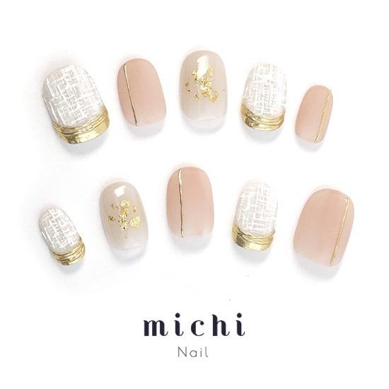 肌なじみのいいくすみカラーとホワイトとゴールドのツイードネイルです。冬はもちろん、春にも使える女子力UPな大人キュートネイルです。