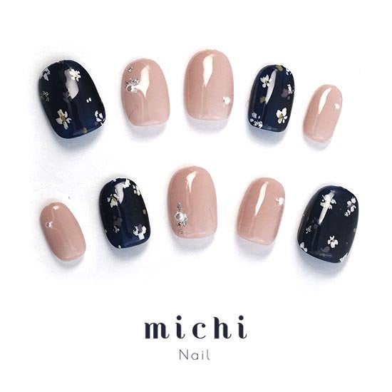シックなネイビーカラーとベージュの品のあるデザイン。さりげない小花柄がポイントです。