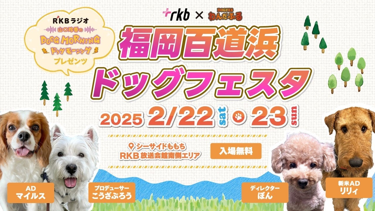 RKB毎日放送(本社・福岡市)は、2025年2月22日(土)・23日(日)、RKB放送会館(福岡市早良区百道浜)で、「RKB福岡百道浜ドッグフェスタ2025」を開催する。ワンコのおやつやグッズなどの店舗やキッチンカーも多数出店。ステージでは、愛犬と一緒に楽しめるショーや、RKBラジオで放送している『山口玲香のDOOG MORNING』の公開録音を実施する。