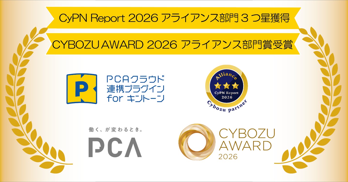 AI技術を活用し、 財務経理・人事労務・販売管理をワンストップでサポートする『PCA Arch』をはじめ、クラウド型基幹業務システムを開発・販売するピー・シー・エー株式会社(代表取締役社長:佐藤文昭 本社:東京都千代田区 プライム銘柄コード9629 以下:PCA)は、サイボウズ株式会社(本社:東京都中央区、代表取締役社長:青野慶久、プライム銘柄コード4776、以下:サイボウズ)が実施するパートナー評価制度「Cybozu Partner Network Report(通称:CyPN Report / サイパンレポート)2026」のアライアンス部門において、「PCAクラウド連携プラグイン for キントーン」が最高評価となる「3つ星」を獲得したことをお知らせいたします。