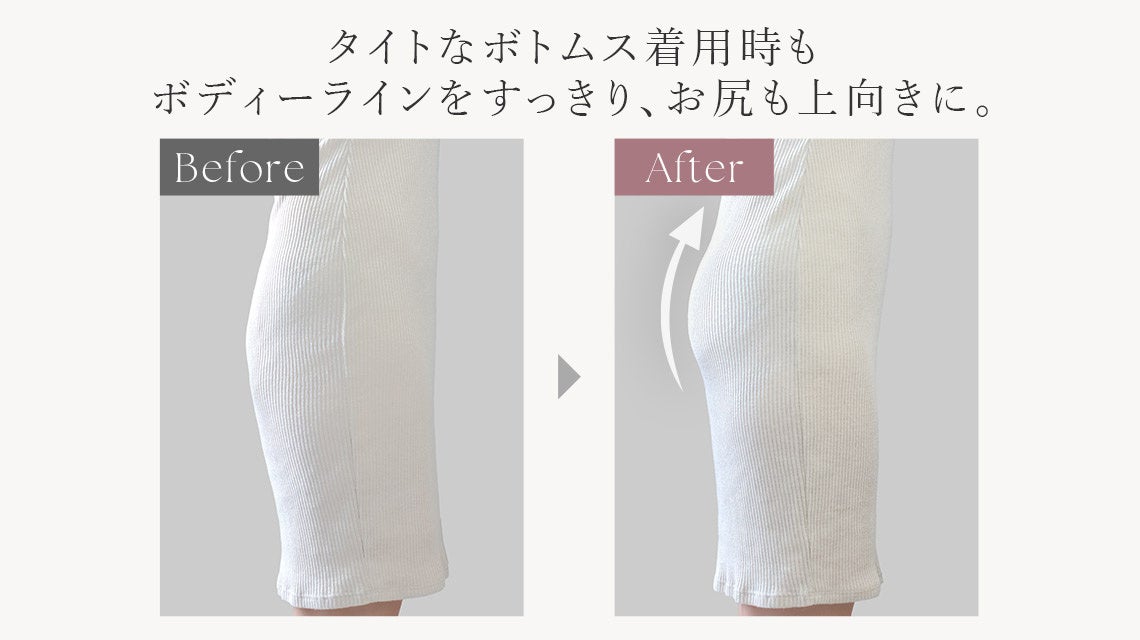 タイトなボトムス着用時もボディーラインがすっきりし、 お尻も上向きに!