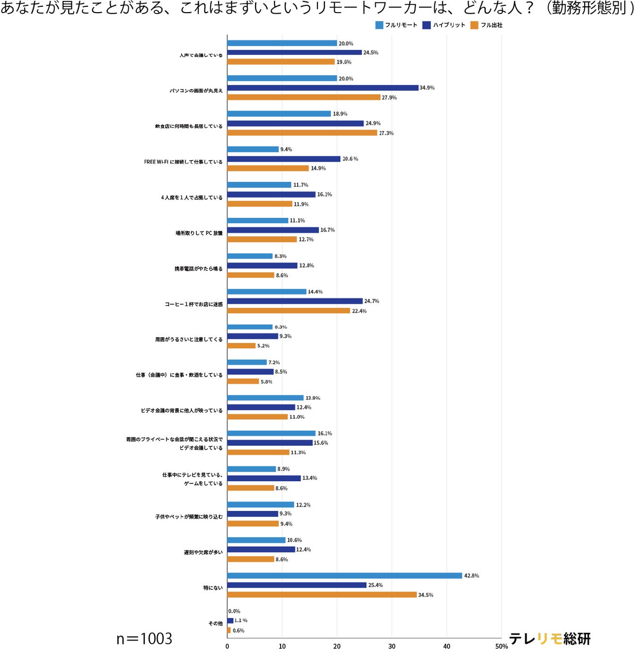 ワーキングパーソンのみなさんに、「あなたが見たことがある、これはまずいというリモートワーカーはどんな人?」と聞いた結果は下記の通り。