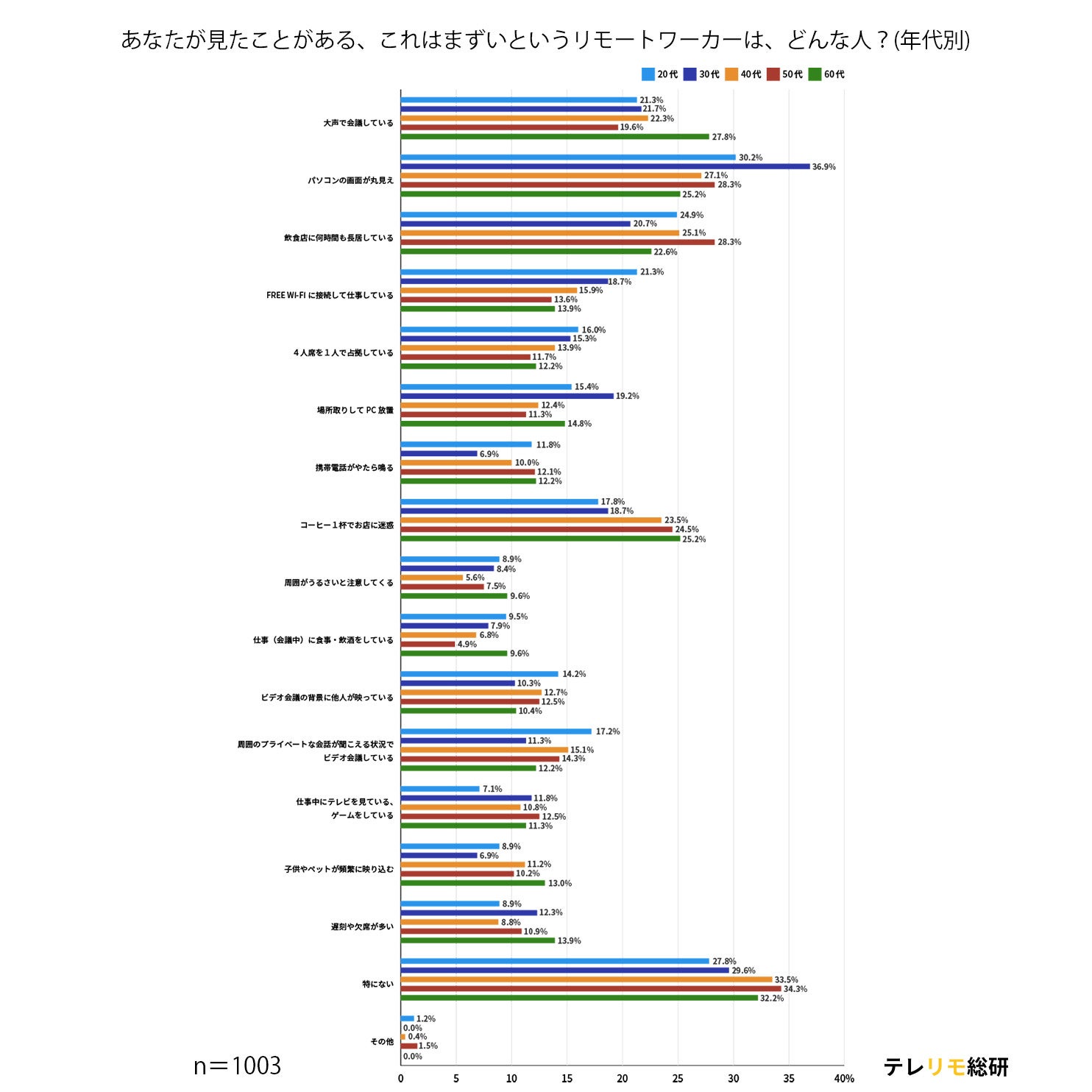 20代から60代に共通して、「パソコンの画面が丸見え」「飲食店に何時間も長居している」「大声で会議している」の項目を挙げる人が多いことがわかりました。