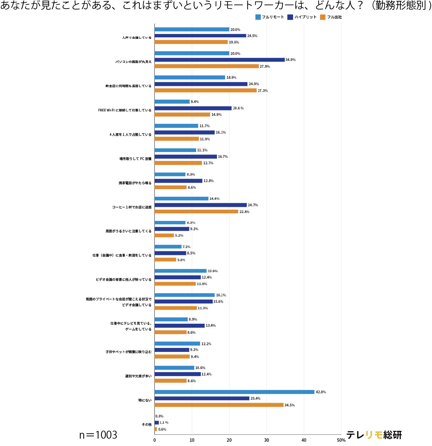 また、次に「特になし」が多いのがフル出社の回答者であることから、自宅フルリモ勤務者とともに、平日のワークタイムに外にいないので、公共の場で仕事をする人を目にする機会が少ないのかもしれません。