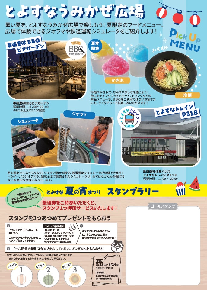 射的や輪投げ、スーパーボールすくいなど子供たちに人気の6台の「縁日屋台」、ジェフユナイテッド市原・千葉のキャラクターがデザインされたエアー遊具「ジェフィランド」が登場するほか、広場に常設の「幕張豊砂BBQ ビアガーデン」や、23日(土)限定出店の「キッチンカー」では、夏限定の冷麺や、映え系かき氷など涼感メニューを提供します。また、本格的な鉄道運転体験が出来る「とよすなトレイン P318」は、通常より3時間延長して20時まで営業します。