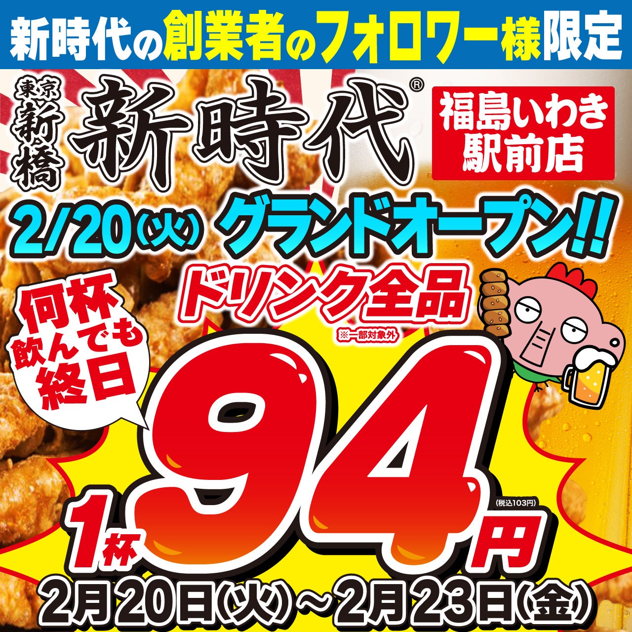 【2月20日(火)~2月23日(金)は、更にお得!】新時代の創業者のInstagramをフォローするだけで、何時でも、何杯飲んでも、1杯94円のお得なセールを開催します
