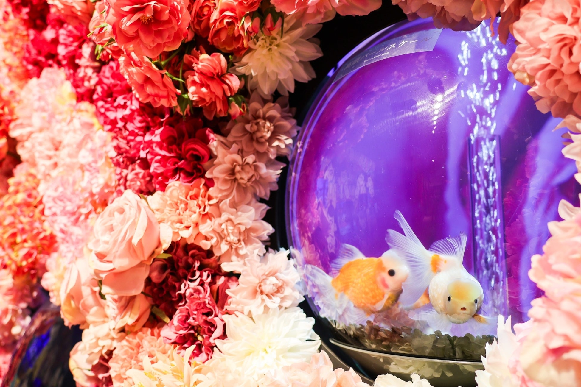 力強い武士の様子を描いた武者絵と、愛らしい桜色の花束の中を優雅に泳ぐ金魚と写真が撮れる人気のフォトスポットです。