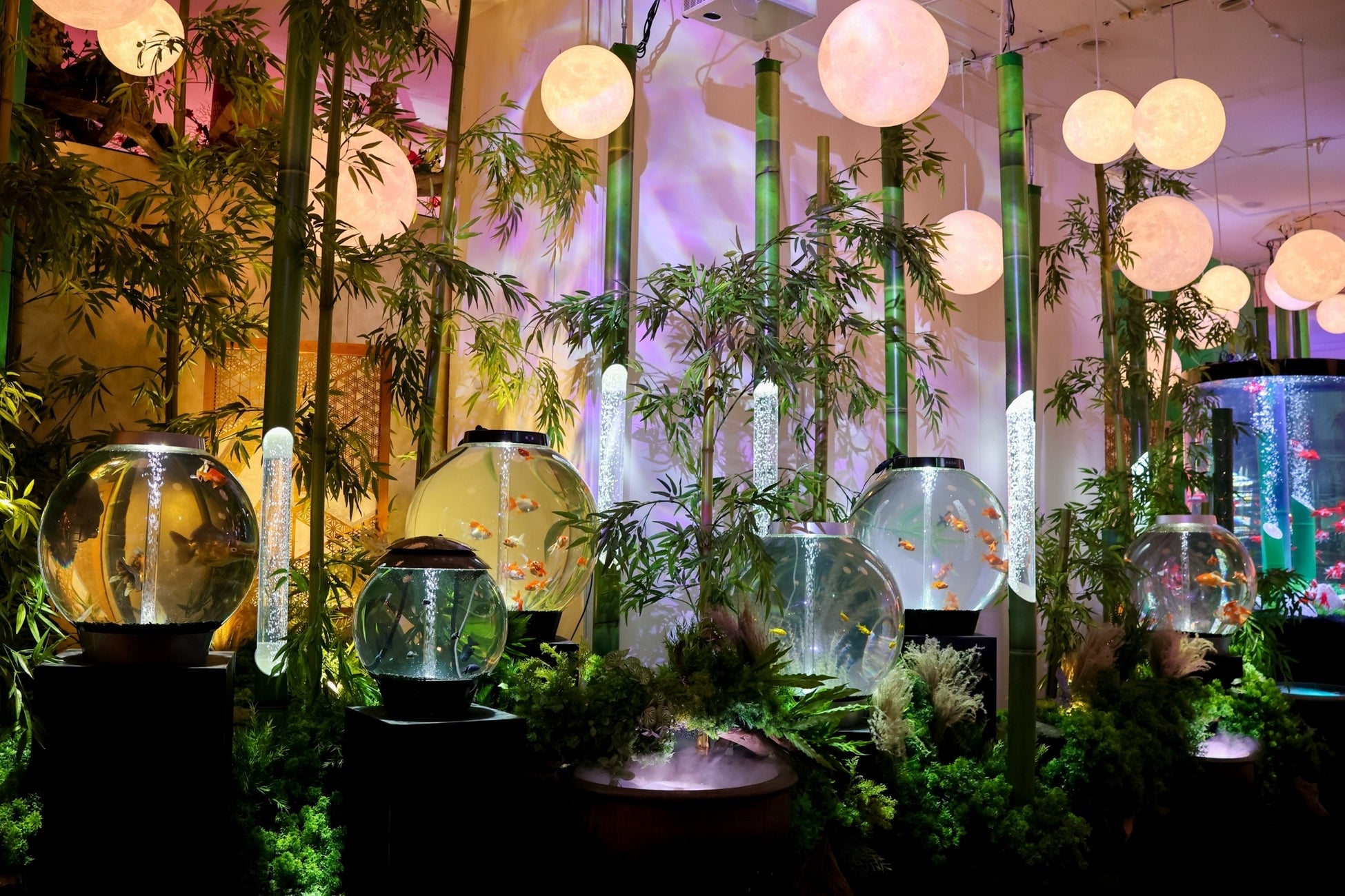 華やかで美しい羽衣をまとった、生命のアートである金魚をかぐや姫に見立て、ネオジャパネスクに仕立てあげた空間です。